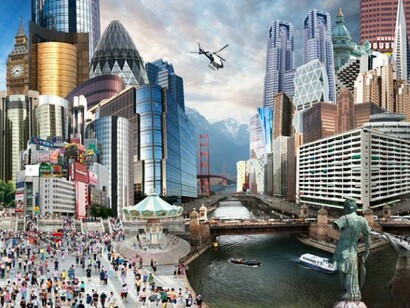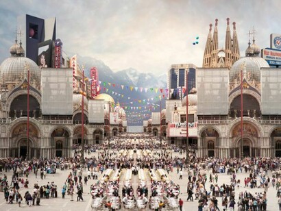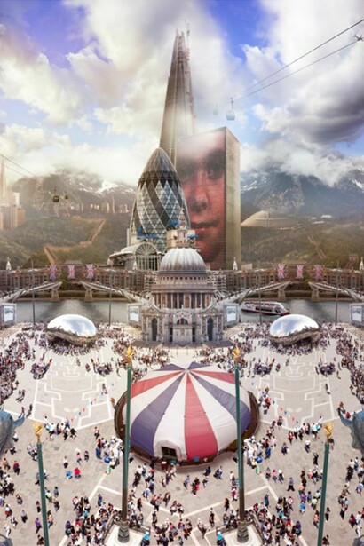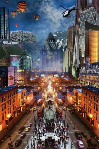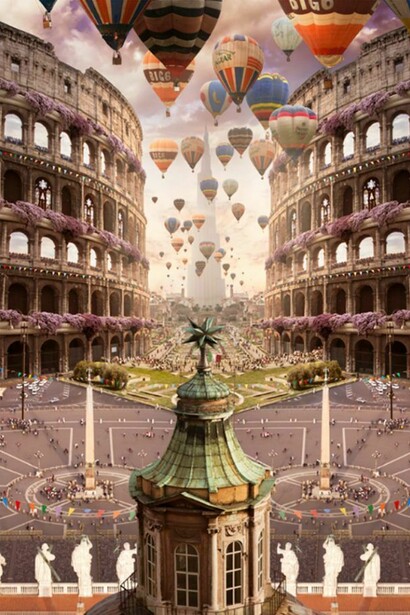 The resulting works test our instincts. Do I recognise that building? Where are those mountains? How do I get the measure of this? What are those people doing? Adding to a sense of wondrous unease is the kaleidoscopic effect created by repeated motifs and themes, enhanced by Leighton’s clever use of colour. Subtle mirror images startle us. We look for patterns within the work, mining the minute details for meanings.The exhibition title, Collective View, hints at some of the many themes of Leighton’s work. A ‘collective’ is essentially a group, or something describing the group. Leighton’s images abound with groups of buildings, people, objects - a flurry of hot air balloons that fill the skies in Colosseum or the night taxis queuing for work in The Shard. But there is also a strange congruence - ‘collective’ also means making a whole.