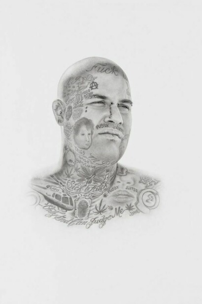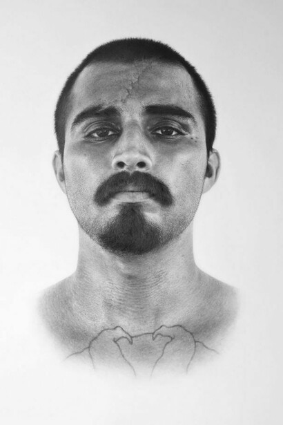 Hand drawn and resolved over many months, the artist diligently – even scientifically – renders muscles, pores, scars, tattoos, and facial hair in painstakingly accurate photorealistic detail.