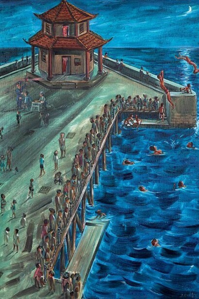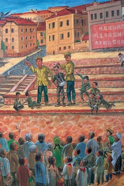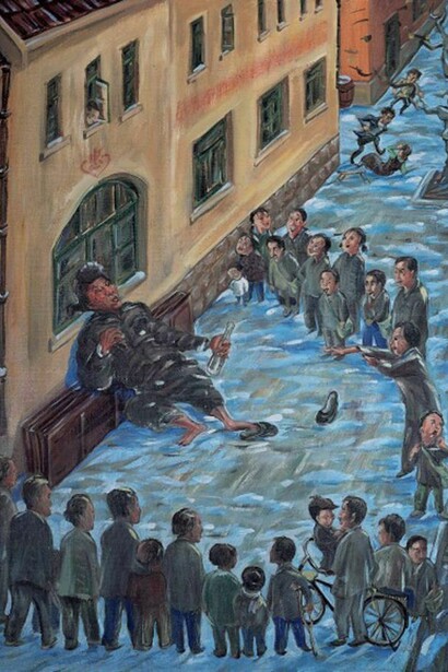 The works include sentimental scenes such as “Listening to Stories Under the Light,” a portrait of his father telling stories to entertain the neighbors in the evenings before the days of television. “When I compare those days to the present, with one-child families sitting around staring at the television set, I get a chill up my spine. I can’t even imagine how DINKS couples — double income, no kids — spend their evenings,” says Liu.