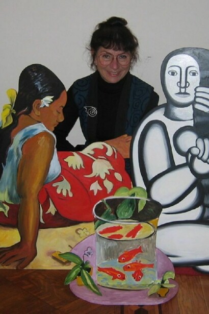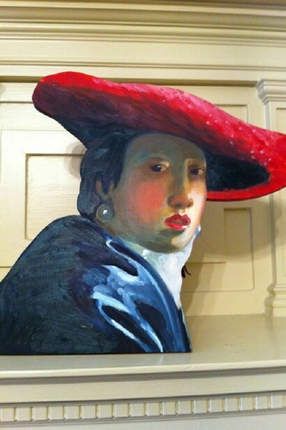 With her life-size freestanding painted 2-D sculptures, the artist Susan Sills whimsically restructures and re-constructs art history. Enlarged to life size, they are cut out of birch plywood and skillfully painted in oils in the style of each Old Master. Using a jigsaw, she releases familiar images from the confinement of the frame and thrusts them into real space to confront the contemporary viewer.