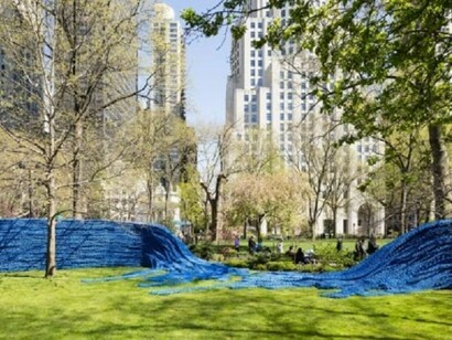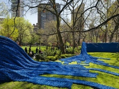 Artist Orly Genger states, “For Madison Square Park I wanted to create a work that would impress in scale and still engage rather than intimidate. In the context of my other installations, the rope used for Big Boss (2010) at MASS MoCA comprises only 10% of the rope used for the project at Madison Square Park, allowing me to work at an unprecedented scale. The tradition of knitting carries the sharing of stories and the installation draws on that idea. The repurposed rope brings with it the stories of different locations and by knotting it, a space is created for the words and thoughts of viewers in New York City to complete the work, creating a silent dialogue that waves along.”