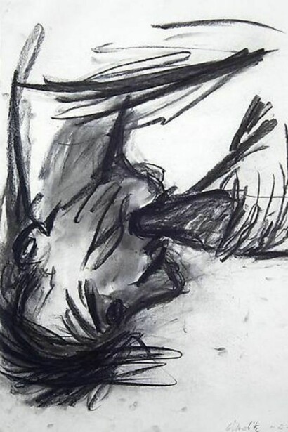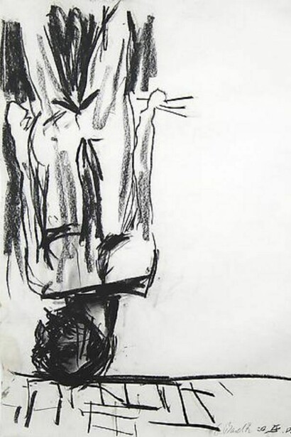 Georg Baselitz’s Orangenesser (Remix), 2005 attests to the prophecy of Eugène Delacroix’s succinct statement. Revisiting his seminal theme of the orange-eater from the 1980s, the upside-down figure painted into a simple composition reflects Baselitz’s concern with the formal qualities of picture- making. Through inversion, Baselitz distorts reality and renders the figure unfamiliar as the picture moves from figuration towards abstraction. In Baselitz’s drawings Untitled (Drinker) and (Drummer) also included in the exhibition, this technique of disorientation through inversion is similarly at play. Baselitz further distances the works in the Remix series from their forerunners as well as from his past, by painting from photographs of the earlier pieces. The pared down canvas and the rapid brush strokes of the Remix paintings demonstrate on a monumental scale the artist’s continued development through this self- referential activity.