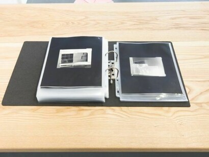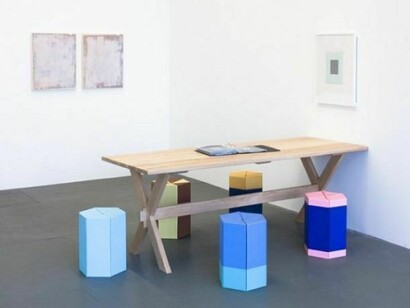 In addition to the paintings, a ring binder on a custom-made table contains nearly one hundred contact prints made from four-by-five inch negatives is also on view. Made within the past year, the images here range widely from multiple-exposed pictures of ocean rocks, portraits of the artist’s wife, studio experiments, and photographs of the Wittgenstein House, which Ou made while on a trip to Vienna in January. These unedited “studies” reveal a diaristic view, like an artist’s notebook, or an inventory of trajectories, ideational investigations, and other possibilities. Perhaps a contrapuntal counter to the imageless paintings, these contact prints open up a latitudinal space from the paintings as a space for contemplation.