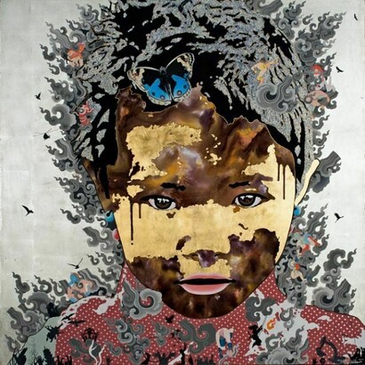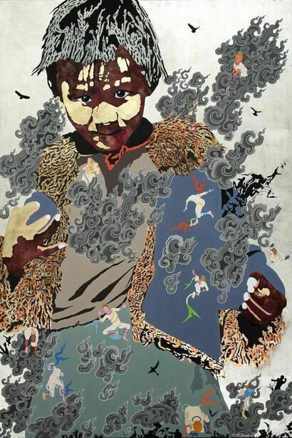 "Golden Child/Black Clouds, is a continuation of my previous paintings using both the Tibetan Spirit iconography from my solo show last year as well as silhouettes. The spirits initially acted as pioneers exploring the new and foreign environments in which the Tibetan Diaspora found themselves living after 1959. Now, the spirits are wiser, looking over a new generation of Tibetan children. The use of children in this series brings immediacy and a more personal connection to today’s events. The spirits still lurk in the surrounding black smoke clouds, bearing witness to all that is unfolding and transforming.