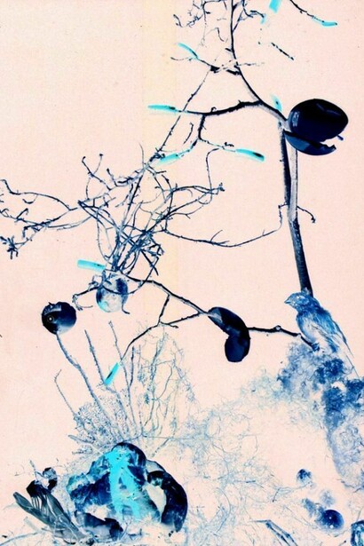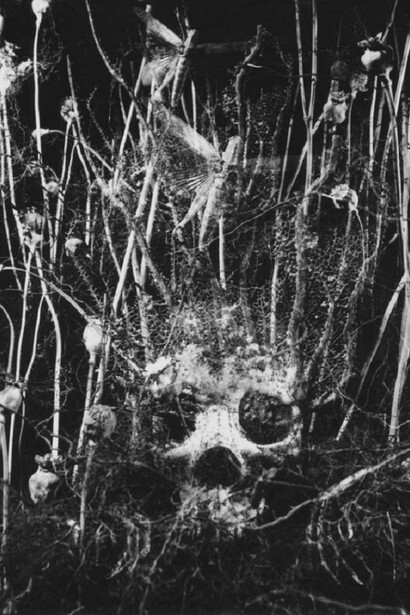 On the walls of this gallery-dwelling, hang as clouds, drawings and canvases, as well as collages, entomological boxes, and as many personified plants as life stories. An animated vanitas displays a bunch of bluebells, which ceaselessly perishes and regenerates. Elsewhere, a myriad of colourful flowers covers the emaciated body of an individual with bulging eyes, whilst a skull decorated with green foliage is reminiscent of reminds us the destiny await living beings.These are the contemporary memento mori. There are also flower portraits, by famous Japanese photographers who might be less well-known in this still life exercise. There is a photo of a rose at the point of its ephemeral perfect beauty or the out of focus photo of a mysteriously highlighted anemone. Or, another of a flower made of bones, which as soon as it is created and committed grasped into memory returns to the earth.