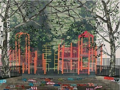 The City of New York Parks & Recreation, in partnership with Edward Tyler Nahem Fine Art, is pleased to announce the exhibition, The Park, by Erik Benson. This new series of paintings, created with thousands of shapes hand-cut from dried sheets of acrylic paint, depict colorful but eerily abandoned playgrounds in stark urban landscapes. Drawings from this series, as well as a stop-motion video documenting Benson’s unique painting method are also on view. These exquisite compositions of urban landscape will be exhibited in the Arsenal Gallery from May 2 through June 20.