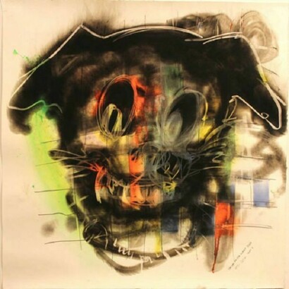 According to Wayne, the process for his Carbon Smoke drawings is: "I have to move continuously while the smoke pours out of the torch. If you have ever seen the film footage of Jackson Pollack painting it is a similar continuous movement, his with drips, mine with smoke and the added possibility of catching the drawing on fire. I enjoy the immediacy and physicality of drawing. The welding torch has the pressure turned down low which makes it sooty/smoky. Working back into the drawings with erasures and brushes reveals what's underneath and a clear fixative sets the soot in place (hopefully) and yes, I have burned the paper and will again."