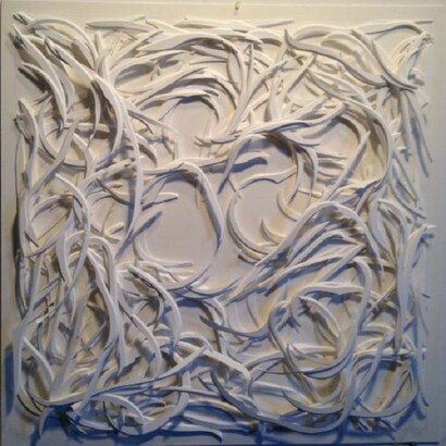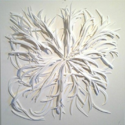 California Artist, Michael Buscemi began his series of white paper collages began in 2012. He wanted to eliminate all existing media and be left only with light, shape and shadow. He takes extra thick rag paper and with a swift and fluid cut, creates thousands of small, shaped pieces. These severed paper pieces are then built up and layered, allowing the shadows and shapes to organically form, before being set with a polimear gel.
