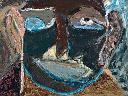 "These are exceedingly dense compositions, and the artist has stated that he was attempting to paint the landscape in the faces. The subjects of these paintings, all gimlet-eyed faces, stare out at us from a primordial darkness, while the potential energy previously locked in the daubs of oil in the earlier abstract works is now unleashed in layers of dark slashing brush strokes." Deven Golden 2013