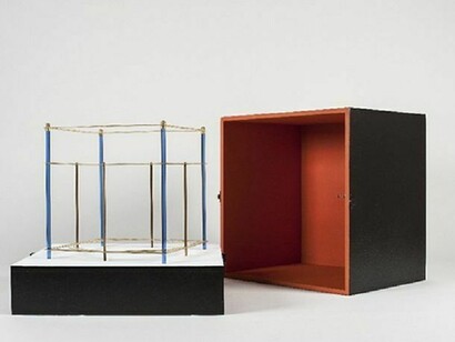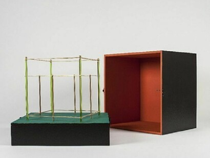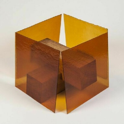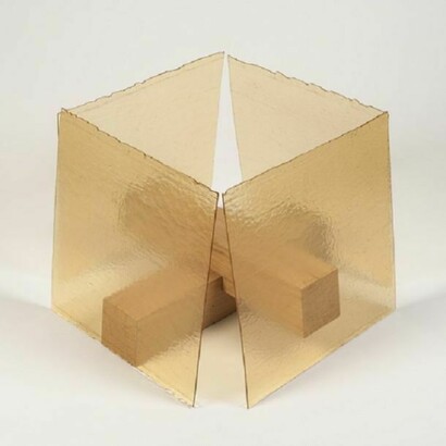 The cubic earth that Flammarion’s work attributes to Plato is the central theme of the exhibition, and at the same time is the one interpreted in the most general and abstract way. The cube appears in the suspended wooden sculptures Approaching Creative People (2002), depictions of cubes in asymmetry that turn on themselves and generate optical illusions – the concave one seems convex and vice versa. The series of sculptures made from four square sheets of coloured glass leaning against wooden supports is based on the form of the cube. As well as the platonic solid, these works pay tribute to Richard Serra’s famous House of Cards sculpture (1969), made up of four square sheets of lead that hold each other up. Finally, the cube, connected to the circle, returns in a cycle of small brass and coloured glass cane sculptures that look like architectural models. Their elegant variations of form and colour are evocative of the formal logic of another minimalist artist, Sol LeWitt, or the fantastical architecture devised by Paul Scheerbart (Glass Architecture, 1914). Each of them, like a jewel or a precision tool, is contained in a wooden box made to measure, which, once opened, also acts as a pedestal.