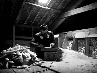 In the installation comprising The Well, Loudspeaker and Splinter – (all 2013), the carefully crafted lattice works of dark wood focus the viewer’s attention on the natural geometry of the eggs, each heightening the other’s innate qualities. The confrontation of the natural form of the eggs with the architectonic one of the ‘cage’, the curvilinear with the linear, dark with light, point up the differences, but also the similarities between the natural and the man-made world. The more closely one examines the world the less ‘natural’ it becomes, the structures of biology and geology are in fact guided by rigorous mathematical formulae and principles of physics; the perfect honeycomb of a beehive; the octagonal tessellation of the Giant’s Causeway in Ireland; the delicate geometry of snowflakes; and at a deeper sub-atomic level everything in the universe is fundamentally an expression of pure mathematical laws.