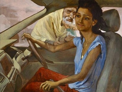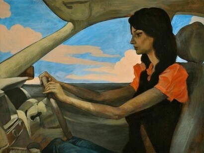 In Girl with Driver, a salmon-colored Honda Civic becomes as luxurious as a silk cravat in an Ingres painting. The artist transforms this common sight in urban Pakistan – a woman in the backseat with a male driver up front – from its quotidian origins into an allegory of the humdrum of the present and the venerable painting of the past, simultaneously beautiful and grotesque. However, Toor’s realism is selective, which can be seen in the fantastical luminosity of the colors and stylized anatomy of the figures, while visual clichés - the woman smelling a flower from the car side – provide a running commentary of the absurd social subtexts of such a scene. The composition and typecast figures in this and other works are culled from the ubiquitous advertisements for jewelry, beauty products (‘Fairness Creams’), new shopping malls and cell phone providers dominating Pakistan’s urban media landscape.