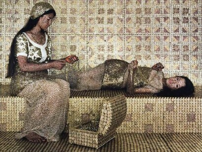 In the works from the Bullets Revisited series, a scene is set in the sort of room one finds in Orientalist painting. Each room – its tiles, woodwork, and other décor, as well as the women’s clothing- is reproduced in faithful detail. But these scenes are created with bullet casings that turn the domestic space into a psychological one, charged with the violence within contemporary society.