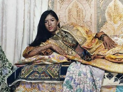 While Essaydi’s new work continues to explore this theme, the subjects of Harem Revisited are clothed in elaborate caftans and their environments are now covered with these richly adorned fabrics. The draperies are dense and have such rich embroidery and complex patterns that when seen altogether, the effect is dizzying, essentially turning the women themselves into objects of decoration, camouflaged within their environments. They become, in effect, a metaphor for the essence of Essaydi’s exploration. These vintage textiles, which were created between the 17th century to the early 20th century for use in wedding ceremonies, to decorate palaces and the harem area, were all generously loaned to Essaydi from the Nour and Boubker Temli collection.