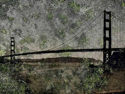 Capturing the passage of time in photographs has been a challenging and careerlong pursuit Morell's. In the beginning, his camera obscura photographs required exposures of several hours, but now with digital technology, it is much faster. He is able to show specific times of day in single images, moments can be pinpointed instead of hours passing, as seen in Manhattan Bridge, Evening (2010). Morell deftly balances a philosophical approach with a scientific rigor, and honoring a Modernist tradition, he continues to experiment. Recently, he has adapted a tent so that he can take his camera obscura works outdoors. The effects of these images hark back to Impressionist painting where famous vistas are juxtaposed with unexpected, nontraditional surfaces, a marriage of two outdoor realities, as seen in View of Golden Gate Bridge from Battery Yates (2012).