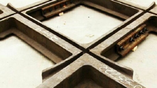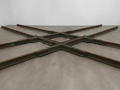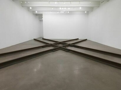 Zach Feuer Gallery is pleased to present Diamond Crossing, a new sculpture by Marianne Vitale composed of decommissioned manganese steel railroad tracks in the form of a dramatic junction. The dominating intersection, extending from the center of the space, creates a wall-to-wall iconic X, obliging visitors to walk, or trip, over the heavy lines in order to see the work from different vantages.
