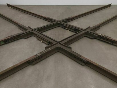 The minimalist geometries found in Vitale’s recent reclaimed lumber sculptures are brought to the fore in Diamond Crossing. The sculpture’s formal elegance is countered by the material, which is left untreated, bearing rust, rail stamps and handwritten markings. The repurposed rails, which are loaded with history and have art historical precedent, provide a set of new formal challenges to the artist – the least of which is weight.