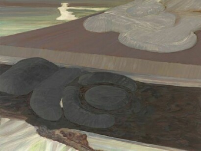 Rhodes usually begins from a visual reaction to things in the world, but she develops her images through drawing and collage, usually from multiple sources. She has written of building up a 'pictorial story' in which some objects have a different presence and association than others. Nevertheless the paintings remain grounded in a reality held at the limits of representation. They must have spatial credibility (Rhodes is not interested in the 'abstracted' as such), and the brushmarks, while they have a literal presence, always investigate something in the world: is the ground hard, or wet; made of chalk or clay or mineral; covered in vegetation or exposed? Rhodes' paintings ask what might be revealed by distance, by moving away from something. Is there something concealed in plain view? Do we need distance in order to be able to see a new kind of 'close-up'?