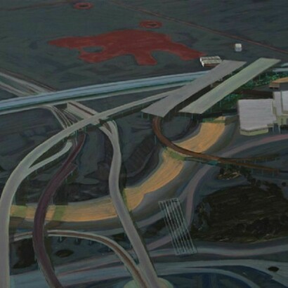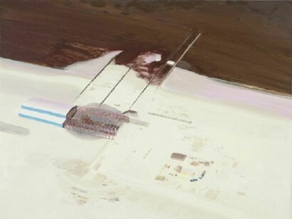 Rhodes’ subtly distinctive paintings appear to have a fairly clear subject matter – edgelands, semi-industrial landscapes, places that serve other places like road networks, refineries, electricity generators and processing plants. They are images of transport, passage, circulation and migration. Art critic Tom Lubbock described them as ‘borderlands, somewhere on the edge of recognition’. There is, however, no simple relationship between the imagery and the meaning. The latter remains elusive. While it is clear that many of the things that Rhodes depicts have a functional purpose, they can also be read metaphorically.