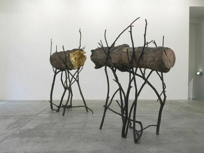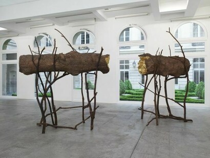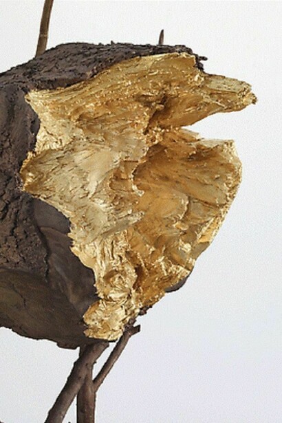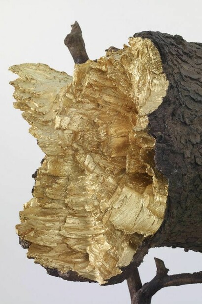 In the main gallery on the first floor two large sculptures composed of several different parts produce a chiaroscuro effect. Tra…., 2008 is in the form of a tree trunk split into two parts resting on branches. The gold leaf illuminates the inside of the split trunk and visually connects the two parts. The branches support the dead trunk as pallbearers would support a coffin. As with the Arbre des voyelles in the Paris Jardin des Tuileries, Penone removed the vitality of the tree; it is as if it were fossilized in bronze. Created using the technique of lost wax casting the bronze sculpture, after its oxidization, took the natural colour of a dead tree.