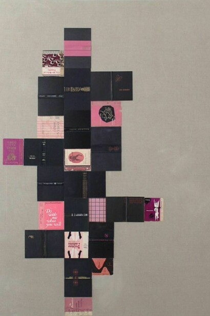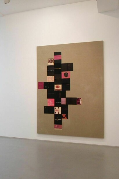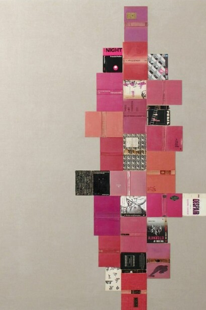 Subjectivity is a key element in Bindings . Each painting seems to contain an arbitrary collection. The book dust jackets and covers are arranged in a manner reminiscent of a modernist grid. Appearing as an exercise in chromatic and compositional balance, the paintings are imbued with poetic qualities, in a gesture indicative of Soares’ desire to make art that is not self-referential. The covers are not only chosen for their formal qualities, but also for the possible associations they can develop within one painting. The viewer's gaze scans this visual labyrinth of colours and shapes, and texts, arranged in multiple directions, each time developing new and subjective connections and narratives.