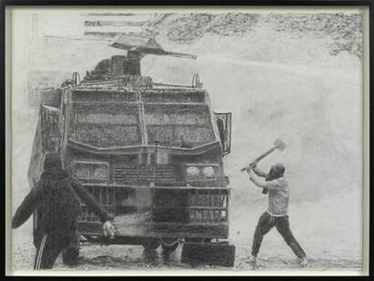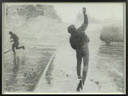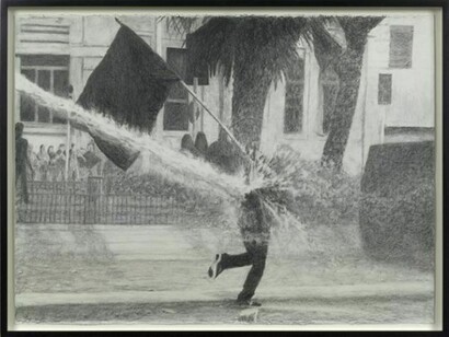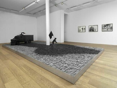 Durant’s tableau at once expresses the heroism and pathos of the defiant revolutionary. At the same time, a sense of absurdity clings to the frozen forms and intermittently spurting water: anarchist and riot truck alike appear locked in futile gestures. The two antagonists are based on two news photographs sourced online, showing uprisings in Santiago in 2011 and 2012 (and the title’s allusion to Duchamp’s Fountain of 1917 – the archetypal ‘readymade’ – subtly underlines the readymade quality of these sources). The work simultaneously reaches into a long history of artistic representations of individuals subordinated by states, whether paintings of Christ’s flagellation or Goya’s The Third of May 1808.