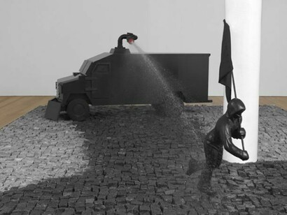 The structure features a reproduction of an armoured water cannon, which sprays a jet of water onto a hooded figure bearing an anarchist flag. Its note of polemic is a defining aspect of Durant’s art. Poised between detached commentary and acerbic critique, it recasts a contemporary episode of state authoritarianism in the ‘stately’ aesthetics of public stonework.