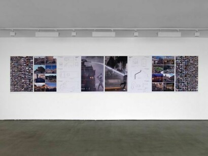 As the title suggests, the construction is provisional and subject to revision in different contexts: the series of graphite drawings (Durant’s first since 2008) maps its potential development. This latest work is one of a series of ambitious projects which explore the form and functions of public structures – most recently Scaffold at ‘dOCUMENTA (13)’, Kassel, a combination of reconstructed gallows used in executions of significance throughout US history (now on display at Jupiter Artland, Edinburgh). Here, as in this latest exhibition, Durant highlighted the endurance of imperialist behaviour and draconian rule throughout the world, and linked modern-day political violence (and its often spurious pretexts) to episodes from history. Durant’s long-term interest in public monuments is also reflected in his ongoing photographic archive of defaced monuments. In addition, Proposal for a Public Fountain follows a body of work commemorating the key figures of the Italian anarchist movement of the nineteenth and early twentieth century in a series of marble busts.