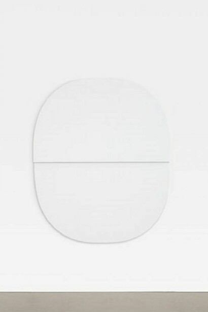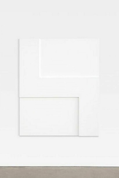 The paintings are executed in oil, built up with many layers of luminous color, including bright yellow, red, and several different blues, in addition to black and white, pale gray and subtle white-on-white works, where shadows are an integral part of the image. The paintings include both single shaped canvases, multiple canvases joined end to end, and canvases superimposed on top of one another to create a three-dimensional relief. The painted aluminum sculptures project from the wall and have reflective black or white surfaces in contrast to the matte surfaces of the paintings.