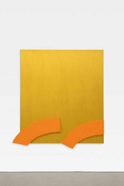 The gallery at 523 West 24th street features Curves on White (Four Panels), consisting of four individual relief paintings, which together span nearly fifty feet. Each painting is comprised of a curved panel painted a single color superimposed over a rectangular white canvas, whose “interplay of differences and similarities weaves a work of powerful internal unity,” writes Jean-Pierre Criqui in his catalogue essay. Gold with Orange Reliefs, a three-panel painting based on a collage from 1962, will be shown by itself at 502 West 22nd street. This work marks the first time Kelly has used a metallic color in a painting.