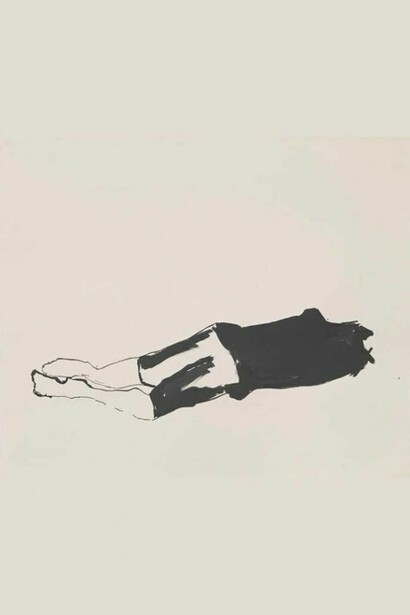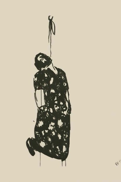Rachel Howard’s ‘’Suicide Paintings’’ were first shown at the Bohen Foundation in New York, in 2007, and exhibited at Haunch of Venison, London in 2008. The series evolved after an acquaintance of Howard’s committed suicide. He was discovered, not in the imagined drama, ‘swinging from the rafters’, but kneeling in a pose almost of prayer. It was this particular detail that Howard found most disturbing, and which led her to create the series, coupled with the fact that for her, suicide is one of the last taboos. The source material came from trawling through forensic magazines and internet sites. These images were then abstracted from their contexts within Howard’s rapidly executed line drawings.