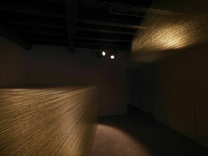 The first room contains the work Further than Beyond: golden strings tensed horizontally between the walls create the bodies of two tetrahedra, one facing the other. The barely visible filaments, which refer to the work of two renewed Venezuelan artists, Gego’s ambient diagrams, and Soto’s Penetrables, as well as to string theory in science, delineate a line between the Earth’s end and the start of the Universe - the space of perception and imagination. The light dims at the ends of each of the tetrahedra, accentuating the moment the work disappears visually, evoking Derridean deconstruction theory.