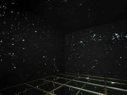 Next, in the second room, we enter a completely darkened setting. Light, movement and mirrors in the work Image Think create rhizomes bridging the material and immaterial worlds, presence and absence... This artificial Universe - created out of black polyethylene perforated with different gauge needles, reflected in the mirror floor and influenced by the presence of the visitor (who is reflected in it) - blends into the space of the self and into the thinking image of our world, oscillating between the physical and mental spheres. Referring to the concept underlying Orwellian “Newspeak”, the title Image Think, with the infinitive form of the verb “to think”, is an attempt to demonstrate how the power of imagination and mental images can survive the degeneracies of language (or any kind of totalitarian regime).