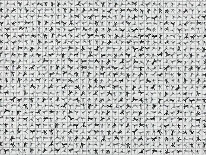 From this black box, we enter a third area, a spatialized white square (Ecce Mundi) covered in hand-drawn canvases with a multitude of rotating minuscule human-like pictograms. In this positive of the cosmos, human beings become star-like figures, constituting a distant-nearby universe with respect to both the drawing-form and the optical phenomena of the figures’ animated movements. Visitors are supposed to walk through the medium and the multitude of its barely visible pictograms, but it is the choice and responsibility of each to decide whether to step in and walk through the work to continue its consumption. This work’s concept questions the image itself, the reasons for its existence, as well as the categories of interactivity, time, space, society and responsibility. The architecture of the white space created here becomes the medium that transmits the image, the palace of humanity, which the human race has, for centuries, been just about to start building.