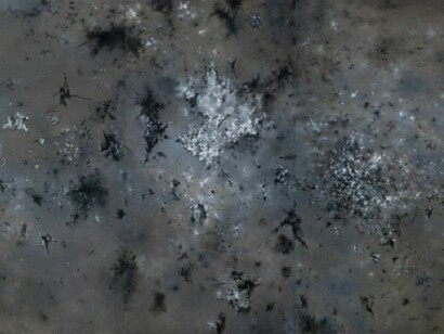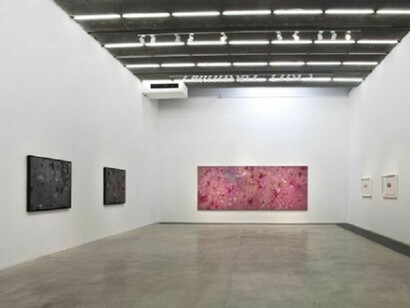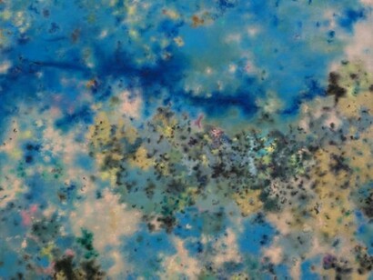 Even at a time, however, when the lush vegetation of the banana plant mostly filled the surface of the canvas, there were occasional glimpses of the background, patterned and textured surfaces that gave rise to several small paintings that she referred to as landscapes. In 2003, while still living in New York, she painted a single larger version of this theme. Since 2008 landscapes have largely replaced the meirenjiao as the focus of her attention. Varying greatly in scale and in palette, these paintings are not landscapes in the conventional sense. They have been described as “landscapes of the mind, the result of countless hours of wandering on the surface of the canvas wherever her intuitive grasp of the medium guides her. These journeys without destination are like long walks through imaginary landscapes, an activity that causes her a great deal of personal happiness. She loses herself in her painting in a totally agreeable way, the finished works reflecting a new level of psychic satisfaction that mirrors her new-found self-confidence and satisfaction with life as it is.”