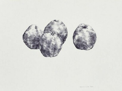 Contrasting with the expansive landscapes is a suite of drawings of pears dating from 2012. Whereas the landscapes are expansive and festive in feeling, the drawings are tightly controlled, the forms of the fruit emerging from countless layers of small, circular strokes. Representing two aspects of her art, the oil paintings and works on paper are nonetheless united by the distinctive movement of her hand which can be utilized to create intense studies of the real world (the drawings of fruit) and evocative landscapes that incite an imaginative response on the part of the viewer.