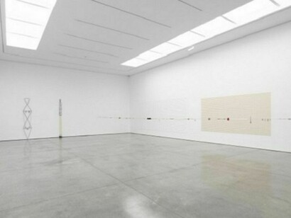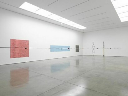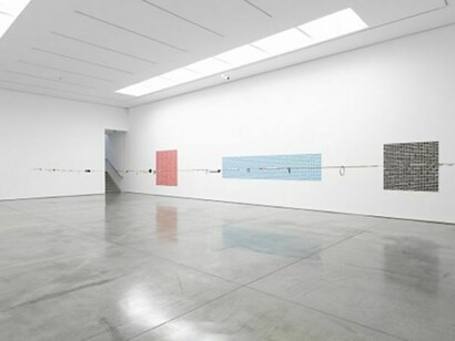 The title 'Hardware Silk' derives from Leirner's obsessive accumulation of ordinary 'found' objects and ready-mades that become materials for her art. Specialist nautical ropes, colourful climbing clips, chains, steel cabling, domestic curtain rings or precision instruments such as spirit levels and rulers, are all items that Leirner uses and objectifies in her interventions and reconstructions. Leirner adopts a formal rigour and aesthetic to the way she collects, arranges and assembles, evident in this exhibition, which includes sculptural wall reliefs, a group of watercolours and a single, 19 metre-long installation that divides the lower-ground floor gallery.
