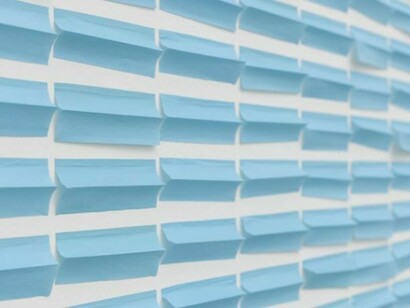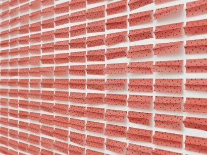 In Portuguese, cigarette rolling papers are called 'papeis de seda' which translates into English as 'silk papers'. Leirner has been an avid smoker for most of her life and through this habit, has come into contact with the various types, colours and formats of these papers. She subsequently became fascinated with the minimal and insubstantial nature of this material for the same reasons that she adopted the incidental ephemera of the museum world - its artwork labels and business cards - in previous work. In the lower-ground floor gallery, Leirner has gummed single Rizla papers directly on to the wall in row upon row to form grids, creating a diaphanous monochrome or minimalist painting that flutters and transforms as the viewer walks past. Titled 'Skin' (2013), the installation references both the habitual, repetitive activity of rolling papers and the physical, tangible nature of this material: a delicate and translucent syphon used to smoke tobacco and pot.