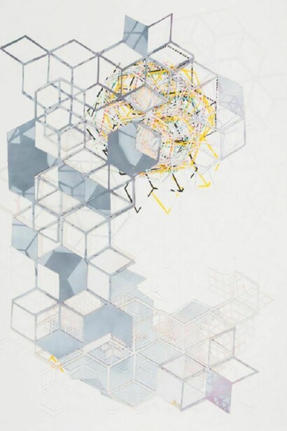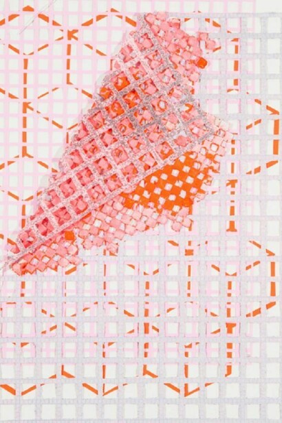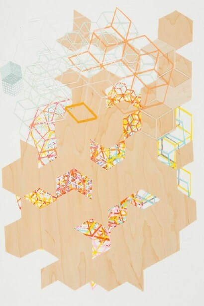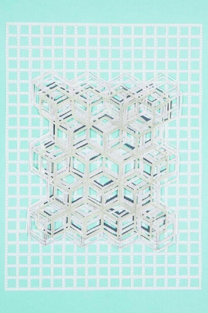 By its very nature, graph paper contains at least two perpendicular sets of lines forming a square grid, inviting activities such as three-dimensional drafting. Using this flat-surfaced grid as the jumping off point, Gaeta builds the illusion of depth with minimalist paper squares and cubes that have been glued flat against the graph paper. At the same time, she creates literal depth by building up layers of paper upon various shapes, raising and precariously overlapping them, adding height and volume to the geometric configurations. The boldness of these vivid, colorful designs, coupled with the delicate, tessellated nature of the thinly cut paper, create striking sculptural patterns that evoke a range of crafts, such as crochet, weavings, mosaics and architectural renderings.