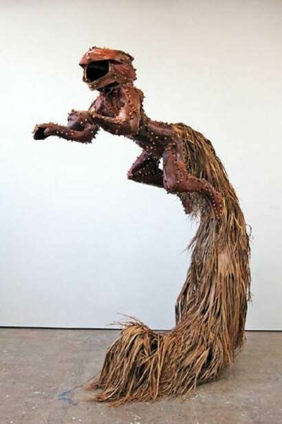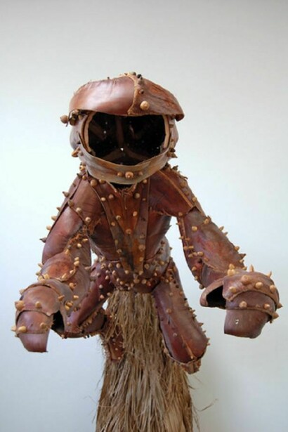 Many of the new works are inspired by materials scavenged from Hawkinson’s garden and suburban Los Angeles neighborhood, utilized in unexpected ways. The sculpture Kookabura—a human-bird-man-machine hybrid balanced on its long tail—is made from the leathery palm fronds found at the base of the trunk, with each piece of armor held together with acorn “rivets.” The totemic figure Trefoil is made out of pinecones and jacaranda logs, joined together by a tongue and groove construction that echoes the surface of the pinecones, breaking the branch down to its elemental particles.