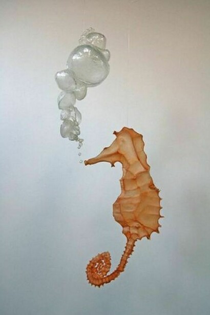 The works also continue Hawkinson’s fascination with the negative space of the human body. While some take the body as subject matter, others explore the human body as material, with non-figurative pieces functioning as unconventional self-portraits. Tagalong, a four-foot-tall seahorse suspended from the ceiling, is made from resin impressions of the artist’s joints—the smaller parts forming the tail are cast from Hawkinson’s knuckles, the larger pieces from his knees or elbow. Likewise, the windows in the lanterns Double Dutch and Shout Out are made from translucent casts that combine the radii of two body parts to create a lens. By casting the most spherical parts of his body, Hawkinson created convex and concave pieces that retain the imperfect texture of skin, including hair, scars, and pimples. In using his own body, Hawkinson extends his reductive process of using materials that are readily at hand.