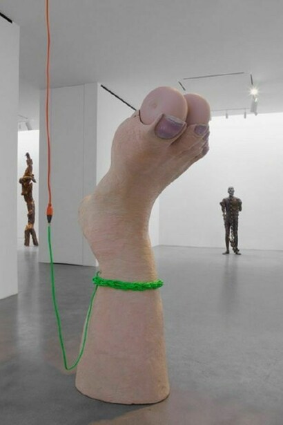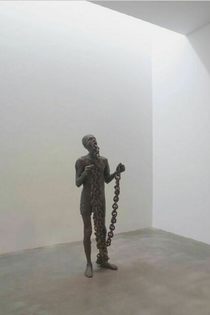 In his exploration of the body and biomorphism, Hawkinson also addresses the way in which humans are enslaved by their senses. Inspired by images of Houdini, the bronze sculpture Samoa is a life-size cast of the artist’s own body, with chains linking the artist’s hands and mouth. The joints of the chain are casts of the artist’s tongue and lips, which join another chain originating from the hands, made of casts of Hawkinson’s thumb and index finger. Though he has previously explored the realm of the senses in his photo-collage and sculpture, this is the most startling work to date.