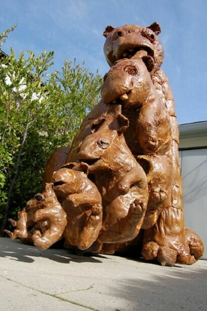 The interest in biomorphism recurs in the nearly ten-foot-tall sculpture Animal Treasures, a “fountain” of species, with each smaller creature held by the scruff of his neck by a larger creature, raising ideas of repetition and regeneration while also creating a kinetic effect through the ball bearings installed in the scruff of each “mother’s” mouth. The ideas of chains and repetition reappear both in the biomorphic, corporeal Bondo link sculpture Do-Si-Do, and in Daisy-Go-Round, which consists of Hawkinson’s young daughter’s bike, sliced into chain links. “It’s not so much about chains as confinement,” says Hawkinson. “Instead, it’s more about things that are linked together.”