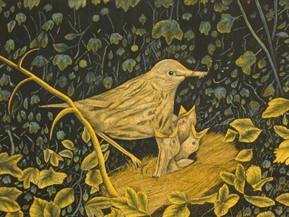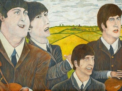 … Applying dot after dot as though in a kind of trance, as though the repetitive gesture was a kind of physical mantra; his world taking shape in front of him while the Beatles wailed and the children scampered and giggled - George Melly, A Tribe of One: Great Naïve Painters of the British Isles. A countryman to the core, raised in Cheshire, with an adult life spent in Yorkshire, rural scenes inevitably dominated his output. An affectionate and quirky portrayal of animals took precedence, and where humans are included in his compositions they are usually involved in rural or agricultural activity – hedging, watling, harvesting and the like. Lloyd’s other chief subject, and a new one for artists, was the cult and depiction of celebrity as seen on colour television (which he purchased after one of his early Portal Gallery exhibitions) and in the many new magazines being published. There occurred an artistic and cultural collision, as Lloyd took images of pop stars and actresses – in this exhibition The Beatles, Cat Stevens, Davy Jones and Chuck Berry – and placed them in his own local countryside.