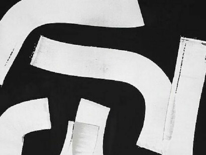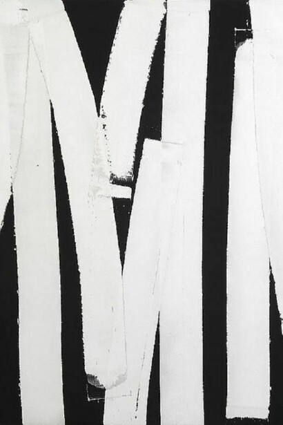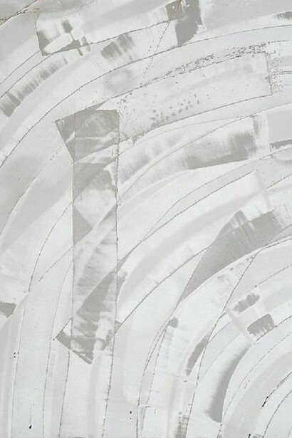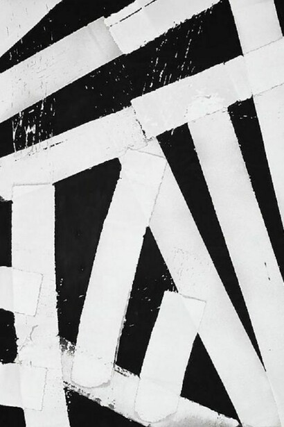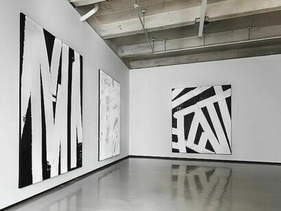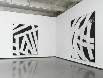 Recalling the extremely slow frame rate of Street Nares slows down the processes of action and creation in his Road Paint series in order to fastidiously record the minute nuances of movement. Isolating the idiosyncratic in the industrial, Nares utilizes a mechanical road striper to run extremely viscous white paint across the black ground of his canvases. Within the fresh strokes, tiny glass beads known as microspheres are deposited, producing an iridescent effect. This highly mechanical but also poetic process creates paintings that inventively echo the organic imagery of his well-known brushstroke paintings, as both uniquely record the passage of the mark-maker through both space and time.