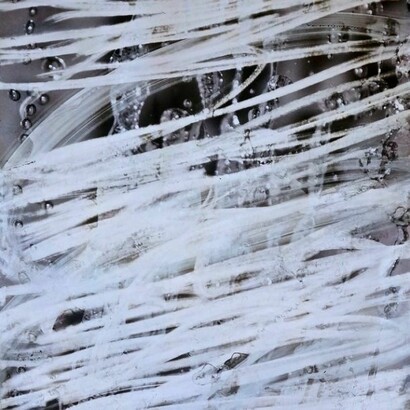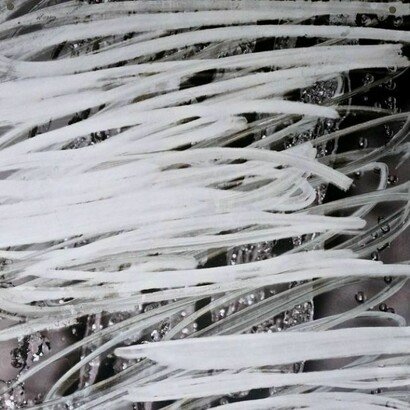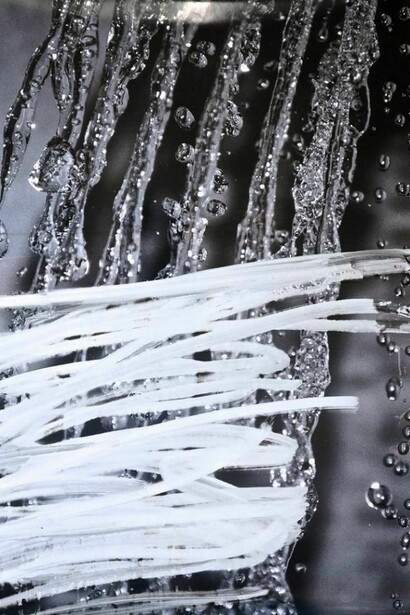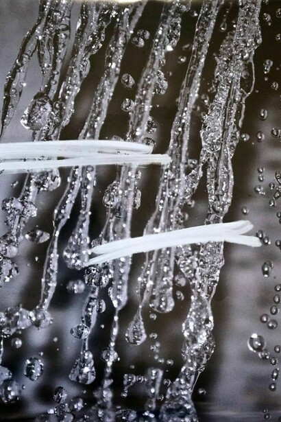 Anti-Perspirant begins with a stock image of water droplets - a signifier of generic signifiers - found on the net. Majed has produced a series of inkjet prints of the image that he disrupts and distorts using acetone with increasing intensity, describing a trajectory of dissolution that finds a terminal point in full chromatic abstraction. This logic of exploiting the fragile relationship between form and function flows into Majed's hanging sculptures.