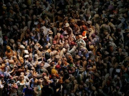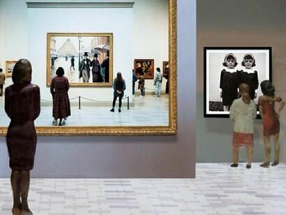 Inspired by works and events of art historical significance, Finkelstein cleverly riffs on the compositions found in canonical historical imagery through his photographic constructions. This is particularly striking in a work like Cathleen and Colleen, 2011, in which the doubling of figures confuses the boundaries between "inside" and "outside" creating an image that plays with the traditional limits imposed by the photographic frame. The image confounds the viewer as they continually encounter a frame within a frame within a frame. This photograph depicts a series of figures contemplating images in a museum: a pair of girls on the right mirror the Diane Arbus portrait of the twins they stand before, while another figure echoes a spectator within the picture she contemplates incorporating a Thomas Struth photograph from his museum series taken in a gallery at the Art Institute of Chicago, which captures a famous Gustave Caillebotte painting.