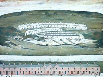 As a modern painter Lowry wished to show what the industrial revolution had made of the world, yet his dominant status in British art coincided with a disappearance of the industrialised world he engaged with. The exhibition’s final room presents for the first time all eight of his less well known, late industrial panoramas, where a leap up to ‘history painting’ size indicates the measure of his final ambition. These large panoramic landscapes fall into two groups: the first, from the 1950s, are titled, with intentional generality, Industrial Landscapes. The second, less well known group was painted in the 1960s in the mining valleys of South Wales, the heartland of the Labour movement. In both the tone is valedictory.
