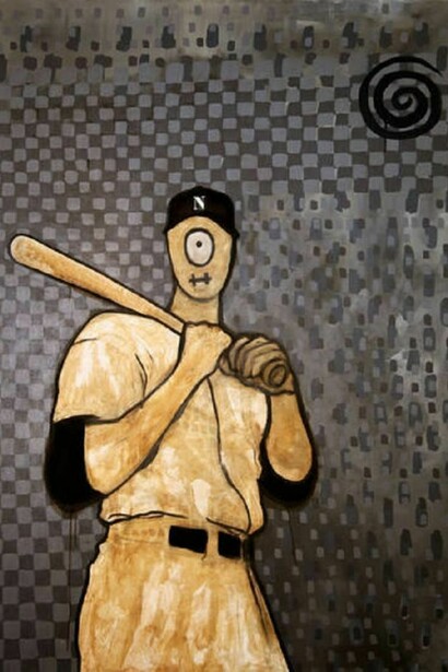 Dim Tim, who has often shown his weird face in McLean’s painting series and digital work, in the Slag Contemporary exhibit bearing his name and subtitled “Fallacies of Hope,” assumes the starring role in the narrative arc. Comic historical cinema is an influence here, and Dim Tim manifests as multiplicity personified, echoing Peter Sellers and Jonathon Winters at their hilarious and fungible finest, or as a man of his times, Zeitgeist embodied (on film), like Woody Allen in Zelig, Sellers in Being There, or Tom Hanks in Forrest Gump. Dim Tim shines as Freud, as Napoleon, as a Yankee titan. The role of Dim Tim, though, is not reducible to dress-up play. He is not just a stylized figuration, a cut-out. He more than just a combination of Baldachuk’s Napoleon at Borodino, scanning the carnage of Borodino in the epic War and Peace, and David’s Napoleon, heroically perched on his white steed. Dim Tim pushes though bathos and the suspension of time. He in some measure curates his own representation with the self-consciousness of a veteran stage performer: for instance, he mugs for the viewer; apparently relishes close-ups and candid turns; and flexes in his poses. He strays into the sphere of sacred clown. He penetrates the moment as an assessor, albeit one installed in place, static, but containing the potential of being animated. These types of self-reflective or model moves imply his awareness of his own subjectivity as focal image. He seems comfortably prepared for a snapshot, or the still, and simultaneously captured, as a combination of form solid in time and yet movable, of time’s action. In short, he is at ease with the Gaze, and even may be up for a mimetic confrontation with it (and the artist or viewer), but he rarely satisfied with enslavement to it. In some paintings, Dim Tim is menacing, threatening, his animus not directed at some Other within the painted universe he inhabits, but at Us, the Gazers! – Milo Santini