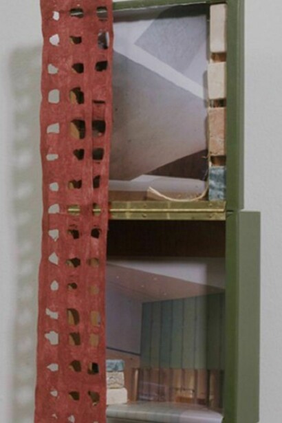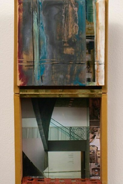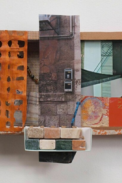 Epstein's photographs capture the elegance of the architecture, but it is in the boxes that she incorporates and personalizes the experience. Epstein is a collage artist with an ongoing interest in the painted boxes of Richard Diebenkorn. With an affinity for the physicality of the materials, Epstein juxtaposed paper, fabric, photos and found material to create a unique three-dimensional space in each box. Incorporating images from Tel Aviv Museum with other collage elements, she creates depth, a sense of looking through exposed and concealed areas. In this spatial give and take, there is also the tension between the simple and the complex, the narrative and the abstract, and the geometry of architecture with the sensuality of color and texture.